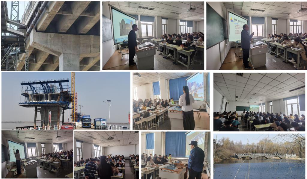 在实习过程中,老师们介绍了松花江公路大桥、松浦大桥、在建的鹤大高速佳木斯过境段多塔矮塔斜拉桥、呼兰河大桥、滨州铁路桥(中东铁路公园)、港珠澳大桥等桥梁工程;京哈高速黑龙江段改扩建工程、京哈高速公路、哈尔滨绕城高速公路等道路工程的工程背景、结构特点以及施工方法。结合工程经验介绍了新奥法、传统矿山法等隧道施工方法,隧道洞口设计考虑原则,以及软土地基处理领域的前沿方法。每讲到一处,同学们一边听老师讲解,一边认真做笔记,积极与同学开展交流。其中,对于市区内的道路桥梁工程,老师们事先到桥梁现场录制好讲解视频,丰富讲座素材。对于目前黑龙江省建桥史上规模最大、建设难度最高的佳木斯松花江特大桥,前后方多位教师合作指导,同学们在通过视频连线的同时,也适时开展了热烈的线下讨论。