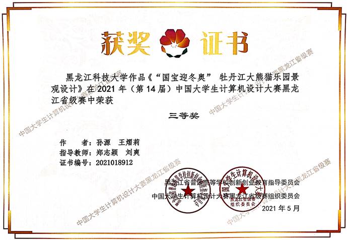 近日,2021年第十四届中国大学生计算机设计大赛黑龙江省赛落下帷幕。经过多日角逐,由best365足球官网郑志颖、刘爽老师指导的风景园林专业2018级学生孙源、王熠莉完成的作品《“国宝迎冬奥”牡丹江大熊猫乐园景观设计》,荣获本次计算机设计大赛数媒静态设计专业组三等奖。