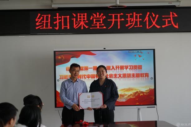 为高标准高质量开展好主题教育学习宣讲,增强纽扣课堂宣讲的质量,学院聘请马克思主义学院韩小南老师作为纽扣课堂指导教师,从专业角度准确把握主题教育要求,对宣讲内容进行审核并提出指导意见,对纽扣课堂小教员进行宣讲技巧的指导。党委书记王月海现场为韩小南老师颁发聘书。